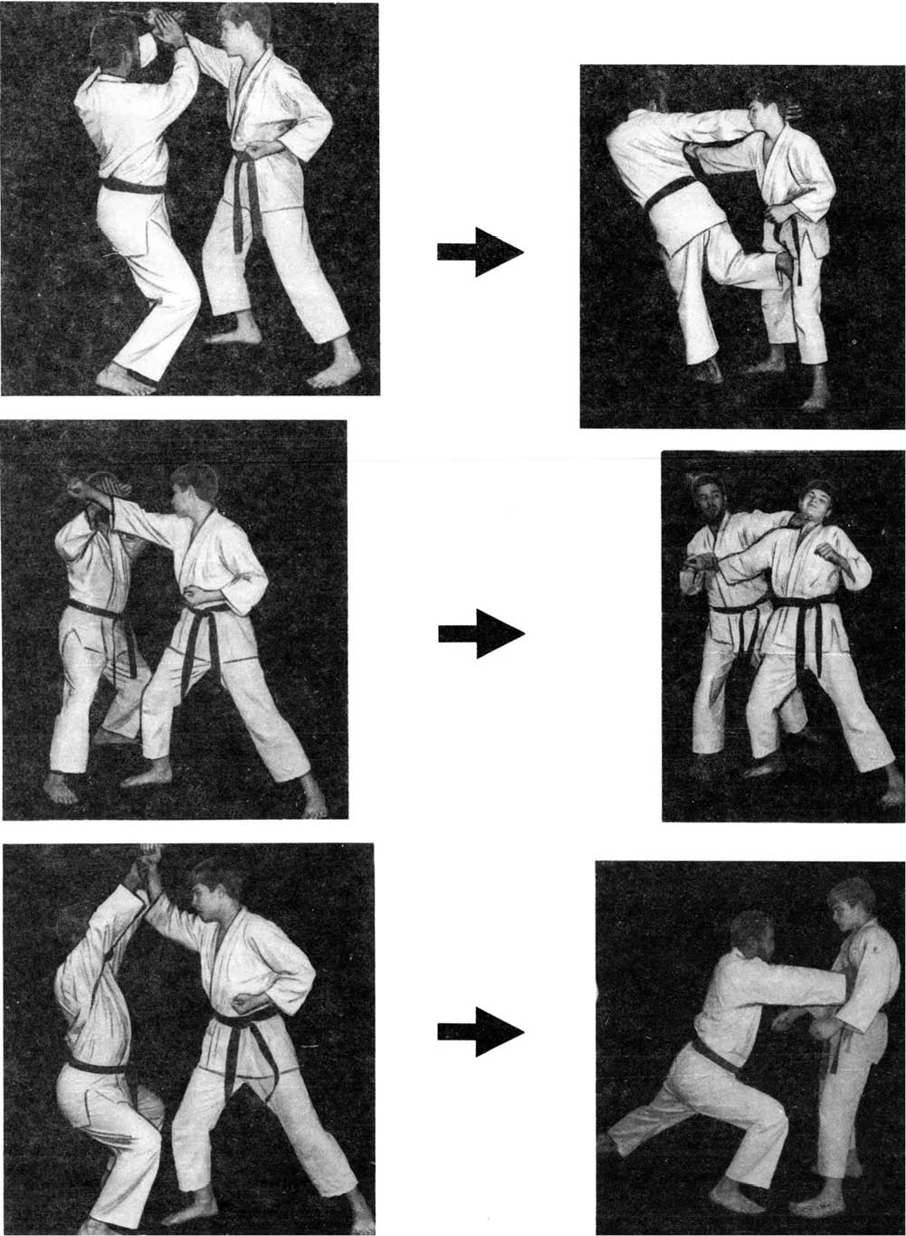 Имея в своем арсенале десяток таких приемов, рассчитанных на различные ситуации, вы невольно приобретете, уверенность в своих силах, что, в свою очередь, поможет вам преодолеть страх. Это – первое условие успешного ведения боя. Никогда не поддаваться панике, многократно увеличивающей в ваших глазах опасность и заставляющей вас забыть о всех, изученных вами ударах, вот первый прием, к которому вас должны привести регулярные тренировки.