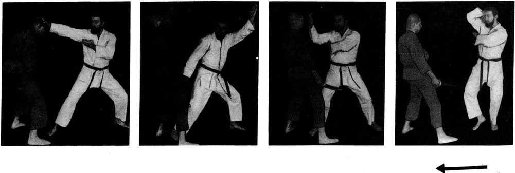 Делая обманное движение правой рукой "уракен-учи" из-за спины по дуге снаружи вовнутрь в пах противника, этой же рукой нанесите из-под левой подмышки "уракен-учи" ему в лицо. С шагом левой ногою к противнику через стойку "каге-дачи", проведите по дуге сверху вниз удар правой рукой "шуто-барай" в пах и тут же, развернувшись через левое плечо на 180 градусов в "киба-дачи", наносим левой рукой удар "шуто-учи" в лицо, шею или висок противника.