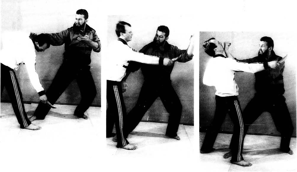 Учитывая то, что противник также ожидает вашу защиту от ножа, вы можете на этом построить свою атаку, используя явные движения защиты от оружия, как обманные, предшествующие вашим ударам в другие точки тела.