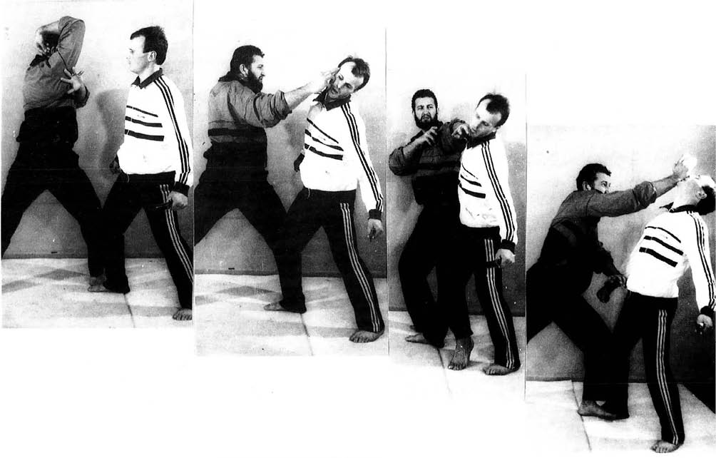 От двух хлестких ударов правой кистью "бара-тэ" по глазам сначала снаружи вовнутрь, а затем изнутри наружу, по дуге сверху вниз перейдите к удару "шуто-барай" в пах и, присев, кистью этой же руки выбросите снизу вверх удар "уракен-учи" в подбородок противника (или "шуто-учи" по шее).