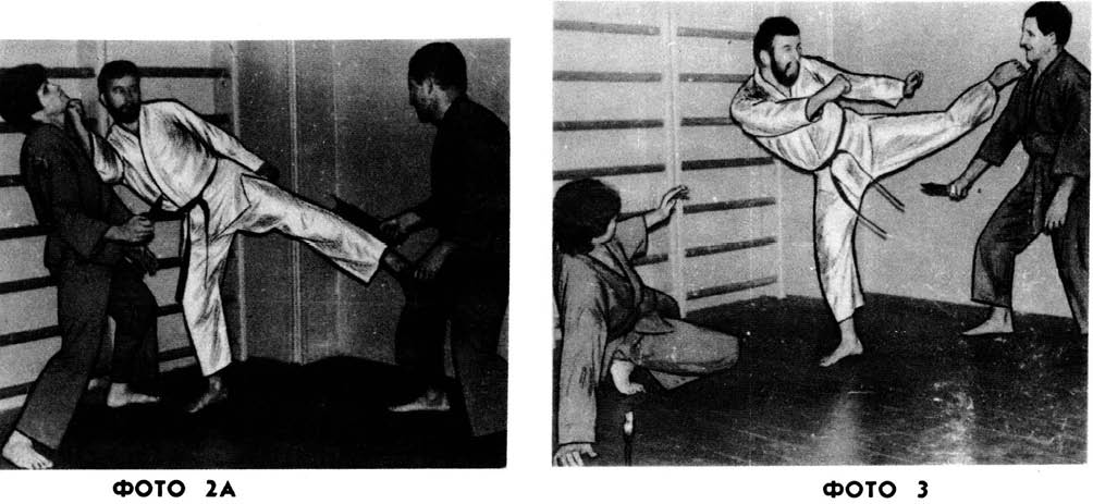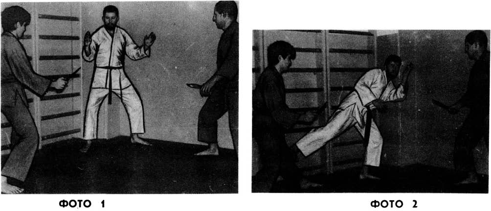 Второй вариант защиты: в очень низком полупрыжке бьете в колено одному противнику /2/ и тут же, через "каге-дачи" нанесите "маваши-гери" и "уширо-гери" другому нападающему, предварительно сделав финт руками в сторону ножа /3, 4/.