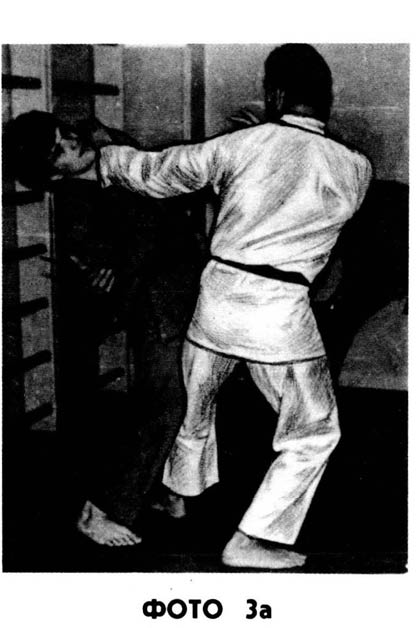 Итак, несколько человек, вооруженных ножами, загнали вас в угол /фото1/. Если позволяет дистанция, не отрывая взгляда от ножей и показывая руками, что вы хотите ударить противников по рукам, с криком наносите одновременно два удара: один– ногою в колено одному противнику, второй– кулаком снизу в подбородок другому /2а/. Тут же развернувшись на 180 градусов, добавьте второму удар "шуто-учи" по шее /За/.