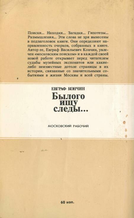 Поиски… Находки… Загадки… Гипотезы… Размышления… Эти слова не зря вынесены в подзаголовок книги. Они определяют направленность очерков, собранных в книге. Автор ее, Евграф Васильевич Кончин, увлечен «московским поиском» и в каждой своей новой работе открывает перед читателем судьбы музейных экспонатов или какие-либо неизвестные дотоле страницы в их истории, связанные со значительными событиями в жизни Москвы и всей страны.