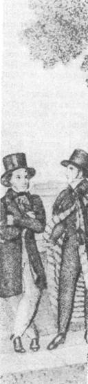 Пушкин с Онегиным на набережной Невы. Гравюра Е. Гейтмана с рисунка А. Нотбека. Фрагмент