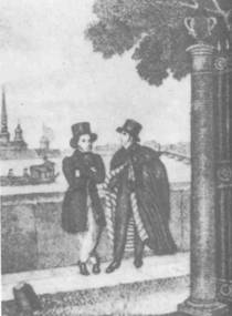 Пушкин стоит с Онегиным на набережной Невы, против Петропавловской крепости.