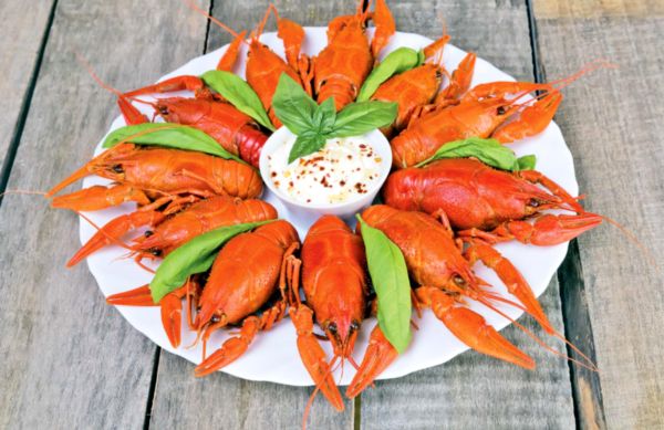 Раков промойте, бросьте в кастрюлю с кипящей водой, посолите, добавьте горошины перца и половину зелени. Варите 20–25 минут. Извлеките шумовкой, очистите «шейки». Отдельно отваренные вкрутую яйца порежьте. Выложите на блюдо раковые шейки, посыпьте измельченными яйцами, полейте сметаной. Посыпьте мелко нарезанной оставшейся зеленью.