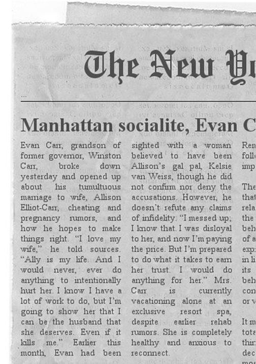 I stop at the top story on Page Six, and blind rage has me seeing red. I can clearly read the headline—see his fake, solemn mug looking pathetic as fuck—but I can’t digest it. I can’t accept it. It’s a myth, a lie, like the fucking Easter Bunny or Santa Clause.