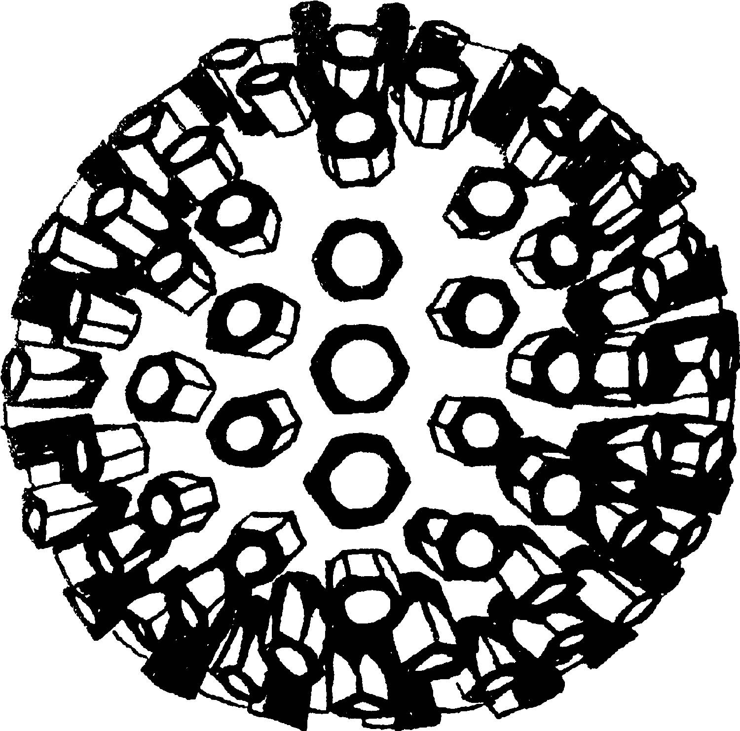 Модель вируса герпеса: пепломеры в виде шестигранных призм далеко выступают над поверхностью вирусной частицы
