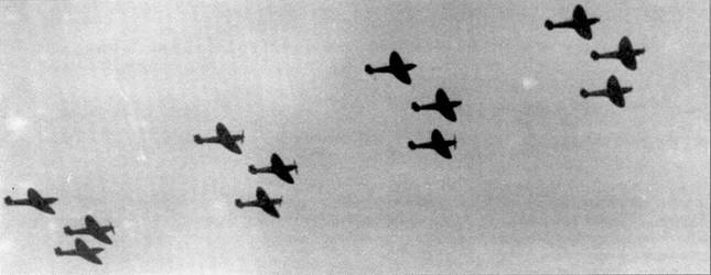 «Спитфайр» 19-й эскадрильи проходят на малой высоте в плотном боевом строю звеньев.