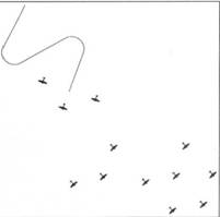 Атака звена «Спитфайров», такой боевой порядок был типичным для начального периода войны. Такой строй был весьма эффективным при атаке бомбардировщиков, но оказался очень уязвимым от атак истребителей сопровождения.