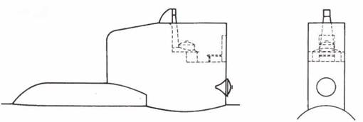 Оказалась, что при варианте а) сопротивление мостика составляет 25% o r общего сопротивления, создаваемого всей подлодкой. При этом на скорости 15 узлов оно состоит только из сопротивления трения. Вариант б) дает коэффициент сопротивления мостика 1,72 и вариант с) – коэффициент 1,57 (или 34% от общего сопротивления лодки). Вариант д) дает незначительное уменьшение по сравнению с вариантом с). По требованию морских офицеров решили остановиться на варианте б).