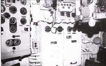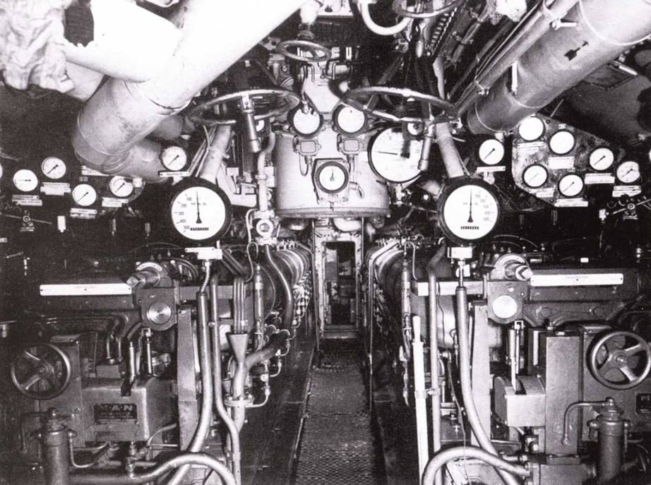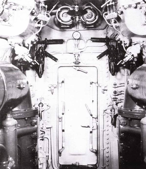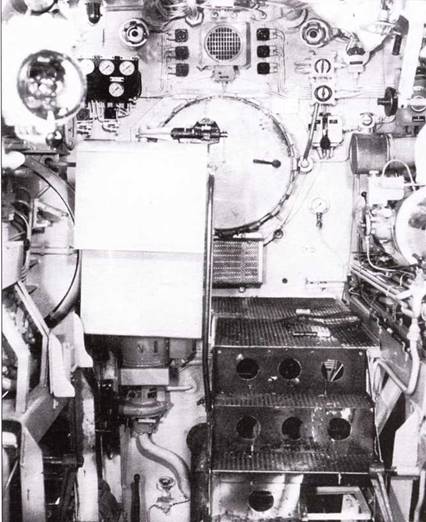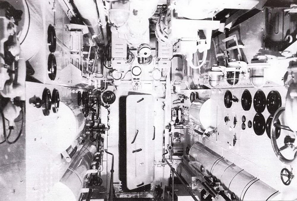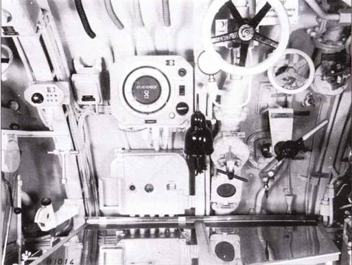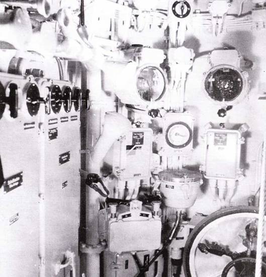 Передняя часть рубки подлодки II190 с кнопочным переключателем руля в центре, справа открытый люк центрального отсека. При движение под водой управление велось при помощи компаса, установленного на мостике. Его показатели были на приборе, установленном справа вверху. Трубы машинного телеграфа справа. Слева под коробкой переключения пульт управления торпедными аппаратами.