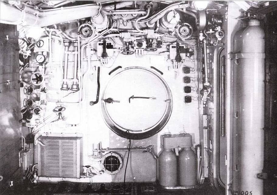 Вид па кормовую часть дизельного отсека подлодки U 190. Под потолком отсека находится клапаны выхлопных газов дизелей. Дизели быт оснащены вентиляторами, благодаря которым выхлопные газы направлялись па вращение турбины. Дверь дизельного отсека запиралась рукоятками вручную или при помощи пневматики.