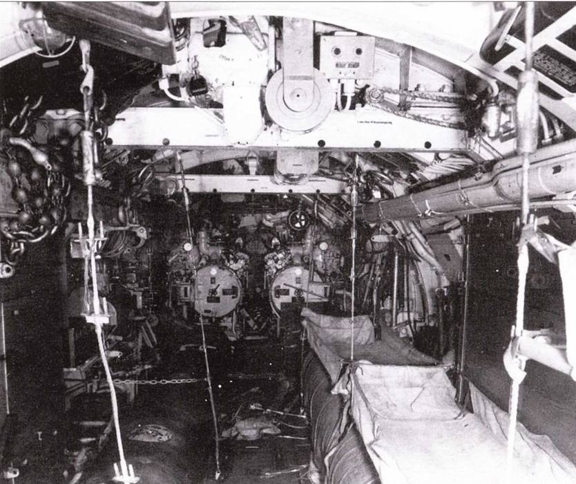 Вид на кормовые торпедные аппараты подлодки U 190. Слева внизу вал привода задних рулей глубины. Справа наверху находится штурвальная колонка, с помощью которой вал, проходящий между трубами ТА, связан с главным рулем эластичной муфтой.