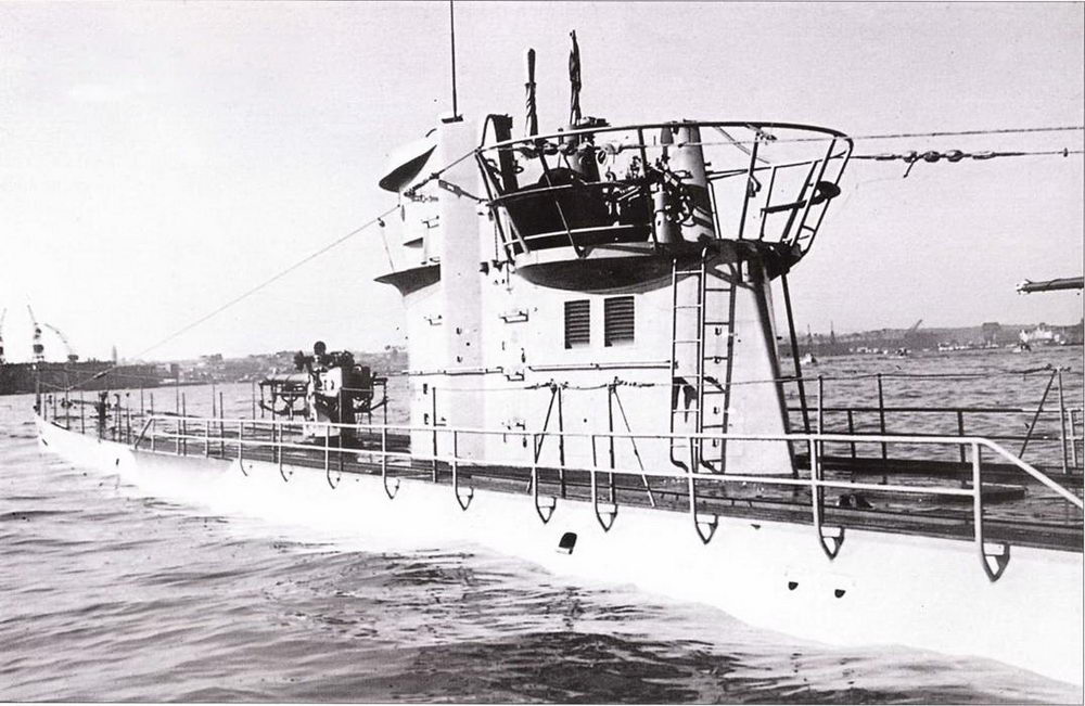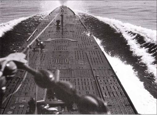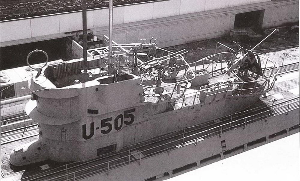 Мостик U 505 с зенитной платформой модернизированной рубки IV типа, который стал стандартным оборудованием на лодках с 1944 г. На верхней площадке «зимнего сада» находятся два спаренных 2-см зенитных автомата, на нижней площадке – 3,7-см зенитка М 42 на лафете типа LM42. Это вооружение в суровых боевых условиях было под постоянными ударами волн и при ограниченных возможностях технического обслуживания не смазывалось. В случае налета вражеского самолёта многочисленные отказы оружия вели к роковым последствиям.