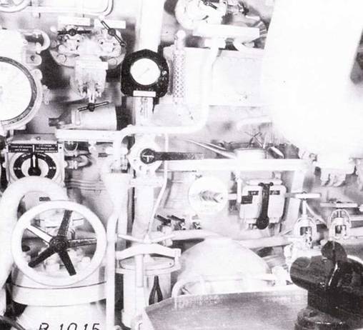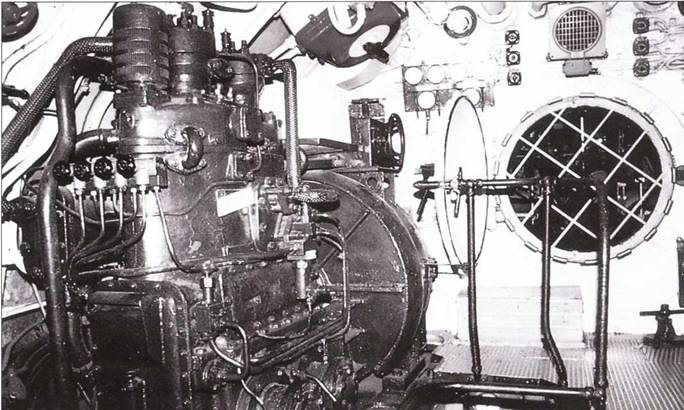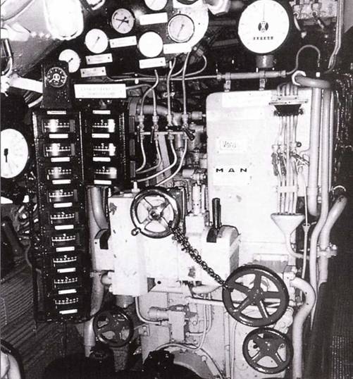 Правая сторона дизельного отсека между Д-шпангоутами № 35 и 17 подлодки U 190. Слева баллон сжатого воздуха для запуска дизелей, другой такой же баллон позади верстака. Над ними система тяг и рычагов клапанов балластных цистерн № 4 и переключатель подачи моторного масла. По обе стороны от машинного телеграфа топливные заслонки правой цистерны и 4 соответствующих подающих вентиля.