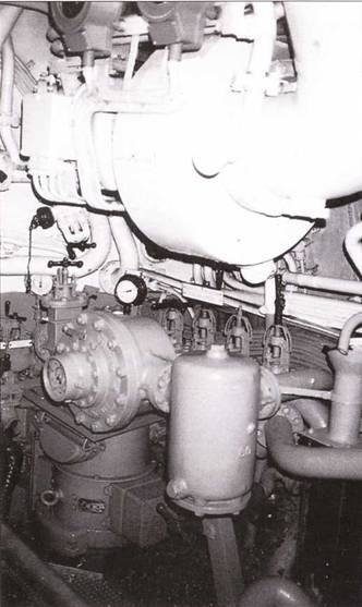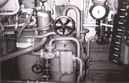 Баллон сжатого воздуха для запуска дизелей справа и слева один из двух 200-литровых баллонов сжатого воздуха дизельного отсеки. Между ними топливный фильтр, а также рычаг клапана балластной цистерны № 4. Справа – приемник машинного телеграфа с датчиком обратной связи.