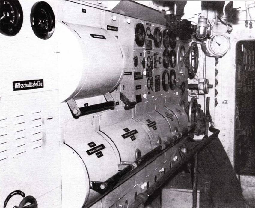 Вид на электрооотсек подлодки U 505 захваченной в 1944 г. Слева позади главного переключателя батарей находится рычаг главного переключателя электромоторов. Ниже спереди находится переключатель для последовательной или параллельной работы электродвигателей. В середине наверху находятся блоки предохранителей и приборы контроля, а также переключатели электровентиляторов. Совсем сзади ручной штурвал для запуски электромоторов. На переднем плаче слева вспомогательная панель 2а, где находится преобразователь напряжения постоянного тока 110 вольт для компасов и запуска торпед.