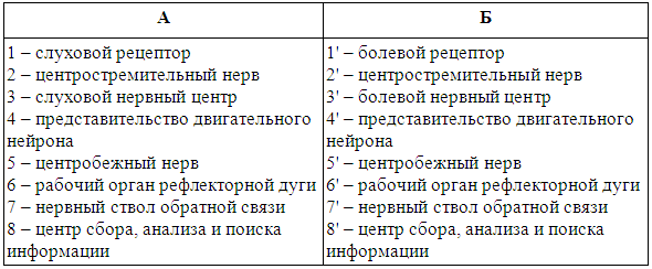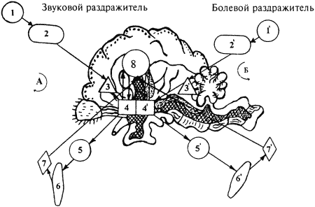 А – рефлекторная дуга безусловного ответа на звуковой раздражитель.