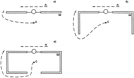 Рис. 4. Схема экспериментальной обстановки для изучения способности животных к экстраполяции (а, б, в)
