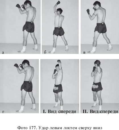 Техника выполнения: примите боевую стойку. Перенесите вес тела на впередистоящую ногу, одновременно разворачивая туловище слева направо, поднимая левую руку вверх, выполните ударное движение согнутой в локте левой рукой сверху вниз. Ударной поверхностью является острие локтя, пальцы кулака направлены на себя. Правая рука и левое плечо приподняты для страховки головы от возможных встречных или ответных действий. Верните левую руку в исходное положение и примите боевую стойку.