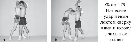 Атака ударом левым локтем в голову сверху вниз с захватом головы противника из положения в клинче.