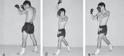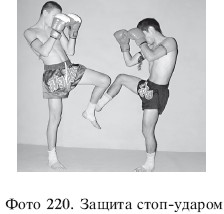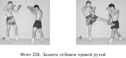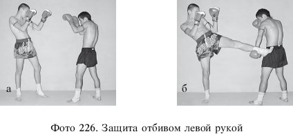 Защита от ударов ногамиВ таиландском боксе принято различать четыре основных вида защиты от ударов ногами. Защита при помощи рук – подставки, отбивы вовнутрь, наружу, накладки; защита при помощи ног (подставки), защита передвижением (шаги назад и в сторону); защита движением туловища (уклоны, отклоны и нырки); также комбинированные защиты, сочетающие при выполнении несколько видов защит. Тот или иной способ защиты зависит от вида удара, от того, какой ногой противник наносит удар, от цели, выбранной противником для удара (ноги, туловище или голова). Главную роль в выборе защиты в бою играют тактические замыслы тайбоксера.