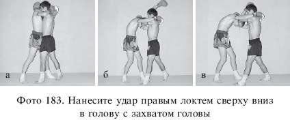 Атака ударом правым локтем в голову сверху вниз с захватом головы противника из положения в клинче.
