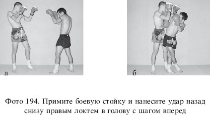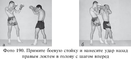 Тактическое назначение: Атака ударом назад снизу правым локтем в голову с шагом вперед.