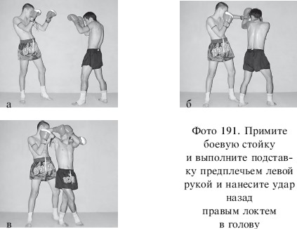 Контратака после защиты подставкой предплечьем ударом назад снизу правым локтем в голову с поворотом туловища на 180°.