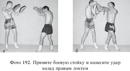 Защита от удара назад правым локтем с поворотом туловища на 180°