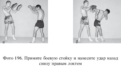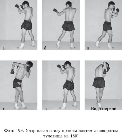 Удар назад снизу правым локтем с поворотом туловища на 180°