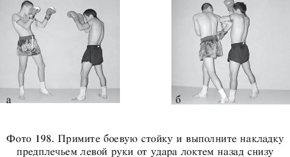 Основным вариантом защиты от удара локтем назад снизу является накладка предплечьем или ладонью.