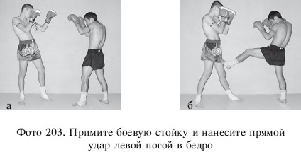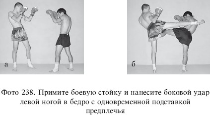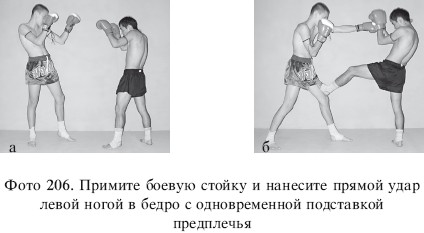 Прямой удар левой ногой в бедро с подставкой предплечья.