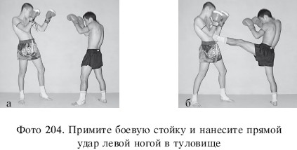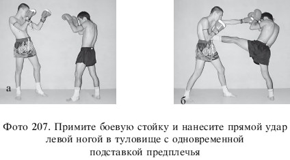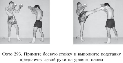 Прямой удар левой ногой в туловище с подставкой предплечья.