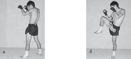 Техника выполнения: примите боевую стойку. Перенесите вес тела на левую ногу, одновременно поднимая вверх бедро правой ноги и направляя голень правой ноги вперед.