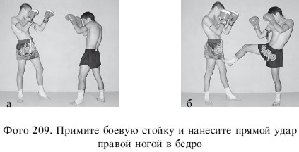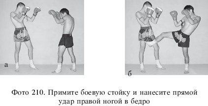 Прямой удар правой ногой в бедро с подставкой предплечья.
