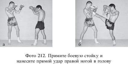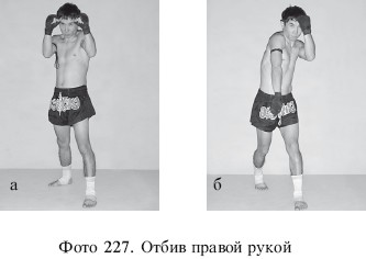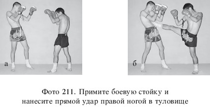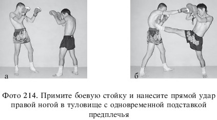 Прямой удар правой ногой в туловище с подставкой предплечья.