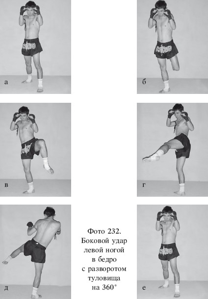Боковой удар правой ногой в бедро с разворотом туловища на 360°(лоу кик)