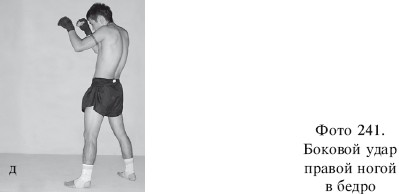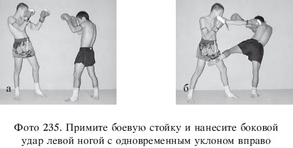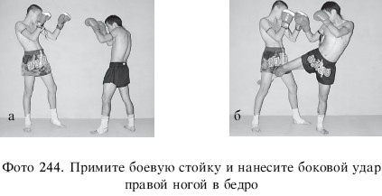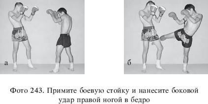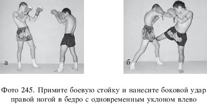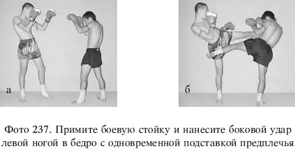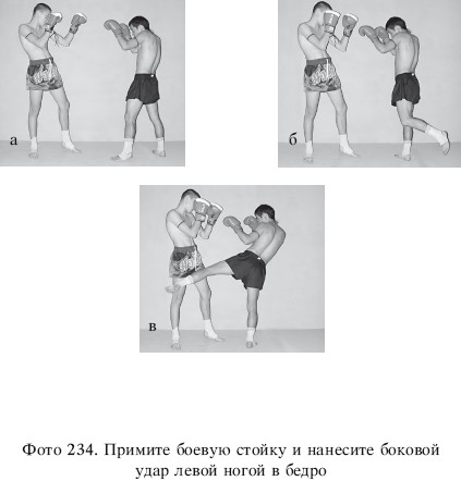 Боковой удар левой ногой в бедро с уклоном вправо.
