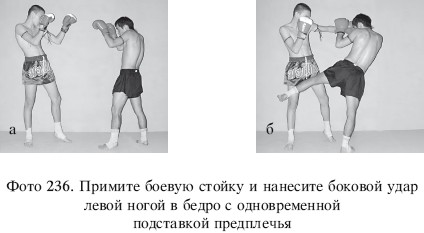 Боковой удар левой ногой в бедро с подставкой предплечья от бокового удара левой рукой.