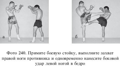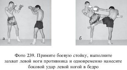 Боковой удар левой ногой в бедро с захватом атакующей ноги противника.