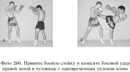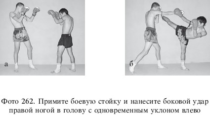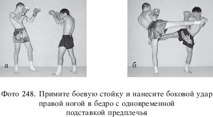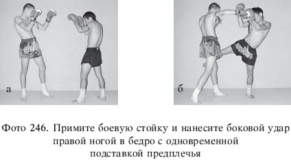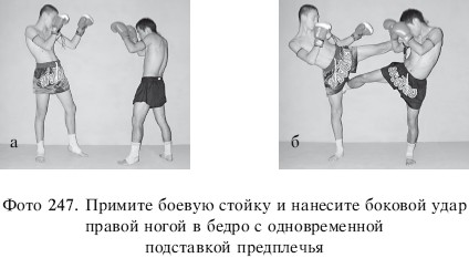 Боковой удар правой ногой в бедро с подставкой предплечья от бокового удара правой рукой.
