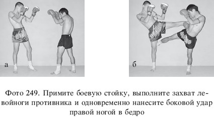 Боковой удар правой ногой в бедро с захватом атакующей ноги противника.