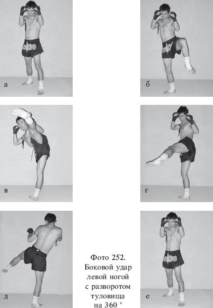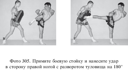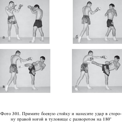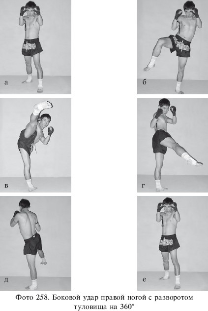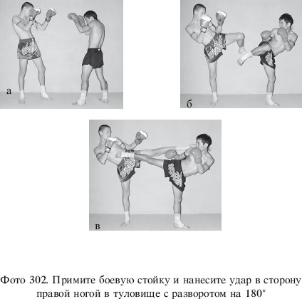 Удар в сторону правой ногой в туловище с разворотом на 180°.