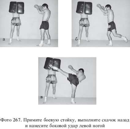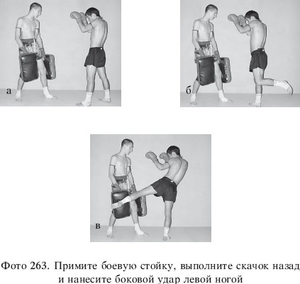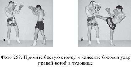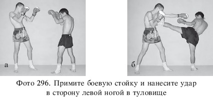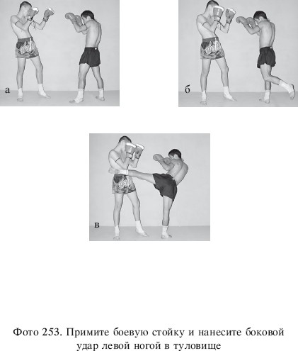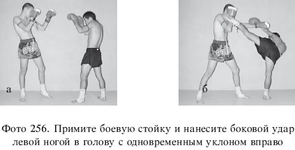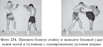 Боковой удар левой ногой в туловище с уклоном вправо.