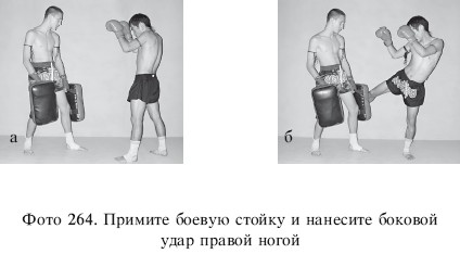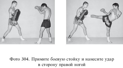 Нанесите удар активным движением таза вперед и разгибанием голени правой ноги. Ноги полностью выпрямлены. Таз выведен вперед, живот втянут, подбородок опущен. Руки и правое плечо приподняты для страховки от возможных встречных или ответных действий. Ударной поверхностью является голень правой ноги. Верните ногу в исходное положение по траектории удара и примите боевую стойку.