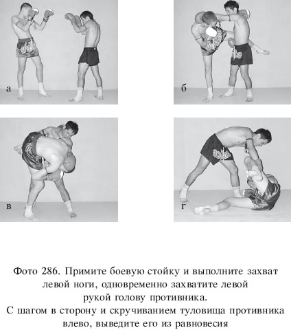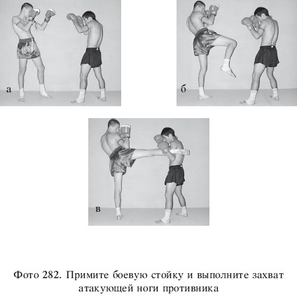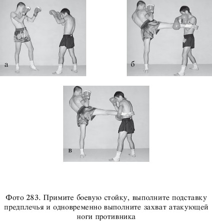 Защита захватом атакующей ноги противника с подставкой предплечья
