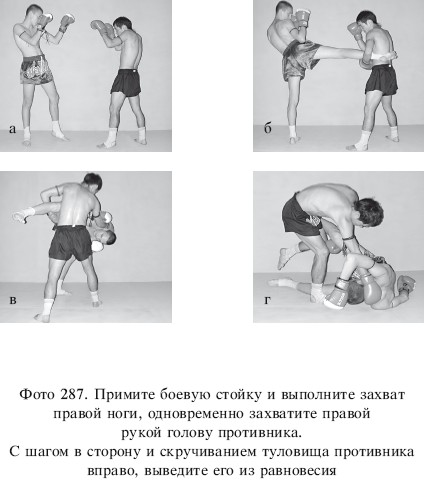 Защита захватом ноги и бросок скручиванием туловища противника вправо