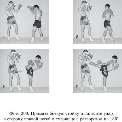 Удар в сторону правой ногой с разворотом туловища на 180°